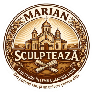 Tot ce vedeți aici este lucrat de mine, de la prima linie trasată pe hârtie până la ultimul detaliu sculptat în lemn. Modelul acesta nu a existat niciodată înainte. L-am făcut după tehnici vechi de sute de ani, așa cum lucrau meșterii când nu exista nimic electric: embosare, sculptură fină, detalii ascunse sub frunze, totul făcut cu mâna mea.